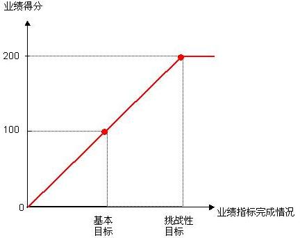最后設(shè)立合理的、富有挑戰(zhàn)性的KPI目標,并為其賦予相應(yīng)的業(yè)績分值。如圖2所示。KPI目標由基本目標和挑戰(zhàn)目標共同構(gòu)成。基本目標體現(xiàn)正好完成對崗位所期望的工作水平,考慮可達到性與合理性,是根據(jù)公司預(yù)算和經(jīng)營計劃而定。挑戰(zhàn)目標體現(xiàn)對完成業(yè)績的最高期望值,考慮挑戰(zhàn)性,是參照業(yè)績圍繞基本目標的變化彈性而定,應(yīng)高出公司預(yù)算和經(jīng)營計劃目標。