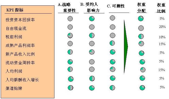 權(quán)重設(shè)定是KPI體系構(gòu)建中一個很重要的環(huán)節(jié),依據(jù)企業(yè)經(jīng)驗,過高的權(quán)重易導(dǎo)致員工"抓大頭扔小頭",對其它與工作質(zhì)量密切相關(guān)的指標不加關(guān)注;且過高的權(quán)重會使員工考核風(fēng)險過于集中,萬一不能完成指標,則整年的獎金薪酬均會受很大影響,因此KPI權(quán)重一般在5%—30%之間。另外出于簡化計算難度的考慮,所取的權(quán)重一般取5的整倍數(shù),并且得分一般利用線性變化算比例。