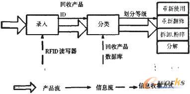 傳統(tǒng)的末端產(chǎn)品處理過程中的信息收集方式主要集中為目測及專家意見,這就需要耗費很多人力來完成,這種過程不僅增加了回收成本,而且造成末端產(chǎn)品回收的不確定性。使用RFID技術(shù)可以通過其方便的數(shù)據(jù)讀寫功能記錄產(chǎn)品整個生命周期內(nèi)的使用狀況,在末端產(chǎn)品回收處理的過程中,只需要查詢產(chǎn)品數(shù)據(jù)庫即可對產(chǎn)品的物理及功能狀況進行了解,從而簡化產(chǎn)品甄別流程,減少不確定性。圖2為改進后的末端產(chǎn)品物流操作流程,通過對RFID及信息技術(shù)的使用,末端產(chǎn)品的處理流程得到了很大簡化。