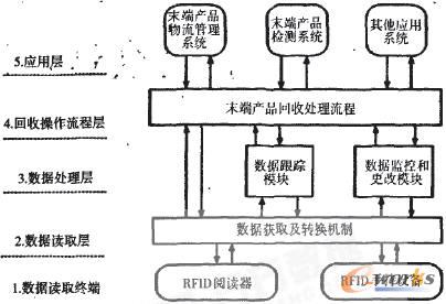 EPC(Electronic Product Code)的出現(xiàn),促使RFID得到更大范圍的應(yīng)用和發(fā)展,統(tǒng)一的編碼規(guī)則以及網(wǎng)絡(luò)化的數(shù)據(jù)庫接口,使得產(chǎn)品信息可以通過網(wǎng)絡(luò)進行查詢和更新。基于RFID技術(shù)的以上優(yōu)點,可以建立末端產(chǎn)品信息系統(tǒng),跟蹤產(chǎn)品從出廠到回收整個生命周期內(nèi)的信息,這些信息使得末端產(chǎn)品的物理狀態(tài)和功能情況非常清晰,從而減少了回收過程中的檢測和評估環(huán)節(jié),提高了末端產(chǎn)品處理的效率;赗FID的末端產(chǎn)品信息管理系統(tǒng)的框架結(jié)構(gòu)分為五層(如圖3所示),分別為數(shù)據(jù)讀取終端、數(shù)據(jù)獲取層、數(shù)據(jù)處理層、回收操作流程層和應(yīng)用層。這五個層次相互配合,完成對末端產(chǎn)品信息的一系列操作,最終將末端產(chǎn)品的信息轉(zhuǎn)變?yōu)闃?biāo)準的可讀取形式,從而可以被應(yīng)用系統(tǒng)調(diào)用。