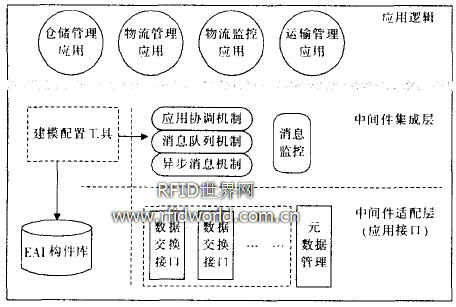 實(shí)現(xiàn)電子物流系統(tǒng)開放性的關(guān)鍵是物流中間件層。中間件層中的適配層提供各種應(yīng)用接口,中間件集成層將應(yīng)用邏輯和應(yīng)用接口有饑整合;诤娇瘴锪髦虚g件的系統(tǒng)結(jié)構(gòu)如圖1所示
