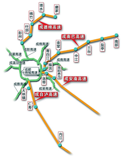 該高速建成后,將與成都繞城高速、成南高速以及省高速公路網(wǎng)規(guī)劃中的南北縱線的第2縱(廣元-街子高速公路)、第3縱(綿陽-遂寧高速公路)一起構(gòu)成成都都市群東部地區(qū)連接東西、貫穿南北的骨架公路網(wǎng)。