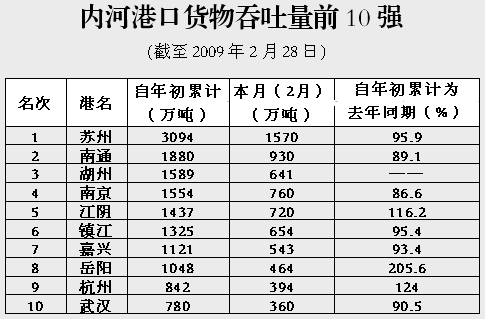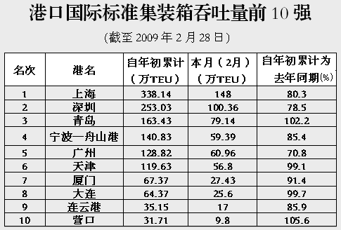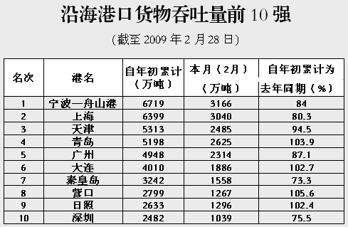 金融危機對我國的外貿出口影響越來越明顯,據海關統計,2月份我國外貿出口總值為648.95億美元,同比下降25.7%,降幅較上一個月擴大了8.2個百分點,外貿形勢日趨嚴峻。受此影響,港口集裝箱吞吐量繼續下探,降幅較上一個月擴大了1.8個百分點,港口集裝箱吞吐量已連續3個月出現負增長,而且降幅仍無見底的跡象。值得注意的是,增幅一向大于沿海的內河集裝箱吞吐量今年來出現了反向,降幅明顯大于沿海。2月份,南方港口繼續以負增長為多,特別是集裝箱干線港影響較為突出,下降幅度均在兩位數。而北方的天津、煙臺、青島等港口均能保持一定的增長!