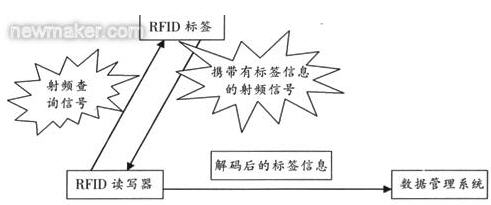 無線射頻識(shí)別(Radio Frequency Identification,RFID)是一種非接觸式的自動(dòng)識(shí)別技術(shù),通過射頻信號(hào)自動(dòng)識(shí)別目標(biāo)對(duì)象并獲取相關(guān)數(shù)據(jù)。通常,RFID系統(tǒng)由電子標(biāo)簽、讀寫器和數(shù)據(jù)管理系統(tǒng)這三個(gè)主要部分組成: 電子標(biāo)簽由天線和RFID芯片組成,每個(gè)芯片都含有唯一的識(shí)別碼,用來表示電子標(biāo)簽所附著的物體;讀寫器用來讀寫電子標(biāo)簽中的信息,讀寫器通過網(wǎng)絡(luò)和其他計(jì)算機(jī)或系統(tǒng)通訊,從而完成對(duì)電子標(biāo)簽的信息獲取、解釋以及數(shù)據(jù)管理;數(shù)據(jù)管理系統(tǒng)主要完成數(shù)據(jù)信息的存儲(chǔ)及管理,數(shù)據(jù)管理系統(tǒng)可以由簡(jiǎn)單的小型數(shù)據(jù)庫(kù)擔(dān)當(dāng),也可以是集成了RFID管理模塊的大型ERP數(shù)據(jù)庫(kù)管理軟件。其工作原理:標(biāo)簽進(jìn)入磁場(chǎng)后,接收讀寫器發(fā)出的射頻信號(hào),憑借感應(yīng)電流所獲得的能量發(fā)送出存儲(chǔ)在芯片中的產(chǎn)品信息(Passive Tag,無源標(biāo)簽或被動(dòng)標(biāo)簽),或者主動(dòng)發(fā)送某一頻率信號(hào)(Active Tag,有源標(biāo)簽或主動(dòng)標(biāo)簽),讀寫器讀取信息并解碼后,送至數(shù)據(jù)管理系統(tǒng)進(jìn)行有關(guān)信息處理。RFID系統(tǒng)的工作原理如圖1所示。