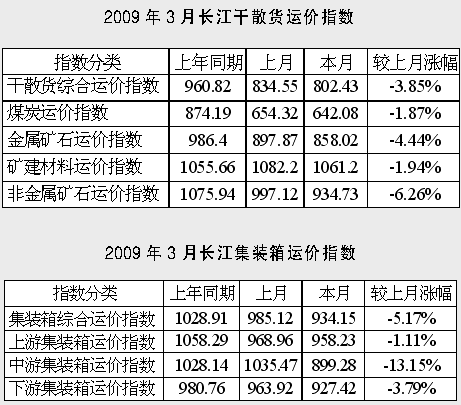 目前外貿(mào)進出口依然黯淡,內(nèi)需勢頭不旺,長江集裝箱船公司攬貨困難,班輪空閑艙位較多,長江集裝箱運輸市場行情繼續(xù)下探。3月長江集裝箱綜合運價指數(shù)為934.15點,較上月下降5.17%。