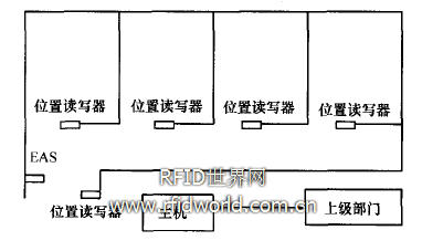 管理系統(tǒng)的硬件主要包括EAS電子物品監(jiān)控系統(tǒng)(electronic article surveillance)、位置讀寫器、便攜式讀寫器等,其系統(tǒng)的整體方案結(jié)構(gòu)如圖1所示。其中主機安裝了管理軟件,并與所有的位置讀寫器連接并對它們進行讀寫控制,如讀取記錄、統(tǒng)計查詢等。電子標簽存儲設(shè)備的名稱、廠家、型號、生產(chǎn)日期、產(chǎn)品標號等信息。