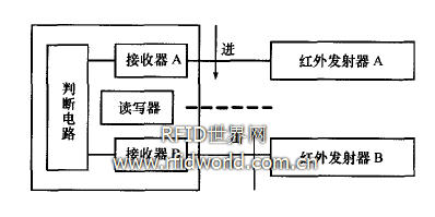 讀寫器放在每個實驗室門口,當帶有電子標簽的設(shè)備進出門口時,讀寫器記錄該設(shè)備,并通過邏輯電路判斷物品進出方向。如圖2所示,主機接收記錄及進出標識,對數(shù)據(jù)庫進行更新。如果物品進入該實驗室,則在數(shù)據(jù)庫中將記錄添加到該實驗室區(qū)域,反之則刪除記錄。這就實現(xiàn)了設(shè)備的進出管理,使設(shè)備的實際位置與主機數(shù)據(jù)庫內(nèi)的信息一一對應(yīng),便于管理人員的查詢、點驗。兩個紅外線接收器用來判斷進出操作。