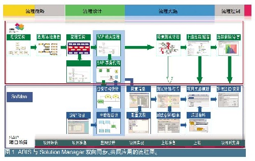 工具和方法都已準備妥當,那如何將其與企業(yè)的獨特需求結合起來并落地實現(xiàn)呢?需求的實現(xiàn)將通過ARIS系統(tǒng)平臺與SolutionManager系統(tǒng)協(xié)同應用來實現(xiàn)。在圖1所示的流程圖中,紅色邊框區(qū)域表示在ARIS軟件平臺中實現(xiàn)的業(yè)務功能,藍色邊框區(qū)域表示在SolutionManager中實現(xiàn)的功能,背景為淺藍色的區(qū)域是ARIS與SolutionManager共同應用,協(xié)同完成的功能。ARIS與SolutionManager的協(xié)同是通過雙向同步的方式來實現(xiàn)兩個系統(tǒng)間的有效集成,進而滿足業(yè)務和系統(tǒng)實現(xiàn)匹配和實施的需求。