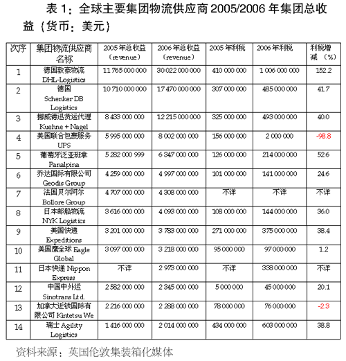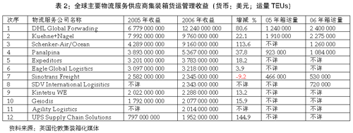 全球物流有關(guān)前14名物流服務(wù)供應(yīng)商2005年和2006年經(jīng)營(yíng)總收益數(shù)據(jù)公布于表1,從中可以看出敦豪物流繼2005年保持世界物流服務(wù)經(jīng)營(yíng)人2006年排名表榜首,關(guān)鍵在于敦豪物流并購(gòu)Exel;排名表第二名,德國(guó)Deutsche Schenker Bahn Logistics也是因?yàn)橛?007年1月并購(gòu)美國(guó)BAX Global物流公司而再次迅速擴(kuò)大物流業(yè)務(wù)規(guī)模;再次名列全球物流服務(wù)供應(yīng)商第三名的Kuehne + Nagel也是因?yàn)橛?006年并購(gòu)ACR Logistics;一系列并購(gòu)活動(dòng)的成功進(jìn)行,再加上歐盟組織全面放開(kāi)郵電市場(chǎng),促使敦豪等歐洲地區(qū)物流業(yè)務(wù)范圍十分迅速地從郵電包裹擴(kuò)大到貨運(yùn)代理和遠(yuǎn)洋集裝箱運(yùn)輸?shù)葮I(yè)務(wù):一旦客戶知道物流服務(wù)供應(yīng)商可以全面包辦海陸空運(yùn)輸?shù)纫徽臼揭约耙徊降轿环⻊?wù),其后續(xù)動(dòng)作必然是讓物流服務(wù)供應(yīng)商擴(kuò)大承包種類(lèi)更多的客戶業(yè)務(wù)。
