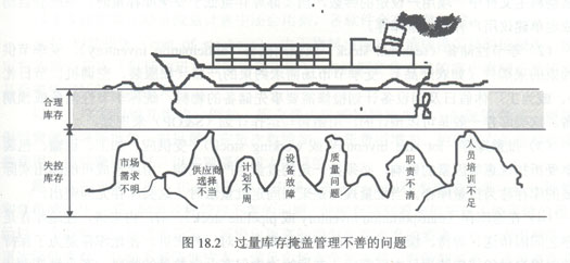 銷售與運(yùn)作規(guī)劃中的表15.3就是宏觀控制庫(kù)存的一項(xiàng)內(nèi)容。而微觀層主要針對(duì)庫(kù)存事務(wù)、盤點(diǎn)及儲(chǔ)運(yùn)等,也就是OA軟件中庫(kù)存管理的主要功能。日本的J1T哲理,把庫(kù)存量比作江湖的水量,把水下的礁石比作由于管理不善造成的各種問(wèn)題,如預(yù)測(cè)不準(zhǔn)、供應(yīng)不及時(shí)、計(jì)劃不周、能力不足、質(zhì)量不高、不重視培訓(xùn)、設(shè)備保養(yǎng)差等等。庫(kù)存量大了相當(dāng)于水位高了,淹沒(méi)了水下的礁石,看上去有利于通航,但是水下被掩蓋了的問(wèn)題(礁石)卻永遠(yuǎn)不能暴露出來(lái),也永遠(yuǎn)得不到徹底解決。因此,庫(kù)存量過(guò)大被喻之為“眾弊之源”。就是說(shuō),庫(kù)存量掩蓋的管理問(wèn)題是永遠(yuǎn)不會(huì)自動(dòng)消除的。如圖18.2所示。