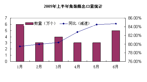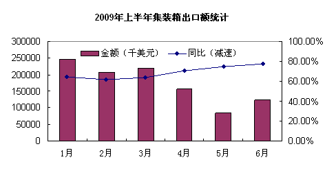 據海關數據統計,2009年上半年,我國集裝箱出口額大幅下滑,其中5月份降幅最大,達90.18%,6月份有明顯回升,與5月相比增加了44.5%。