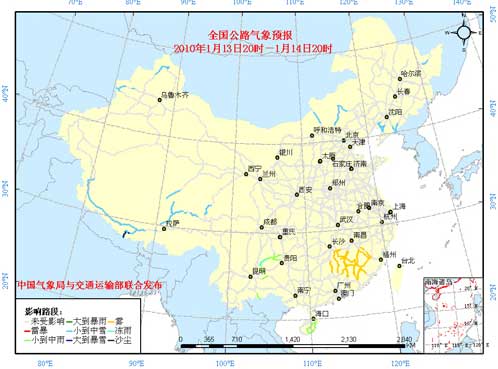 13日20時(shí)至14日20時(shí),新疆北部、西藏大部、青海西南部等地有小到中雪或陣雪,其中西藏西南部的局部地區(qū)有大雪;云南東部、貴州西部、海南大部有小雨或陣雨,其中,貴州西部地勢(shì)高處由凍雨。另外,預(yù)計(jì)今天夜間到明天上午,西南地區(qū)東部、云南東部、江漢南部、江南大部、華南北部等地有輕霧或霾,其中,湖南東南部、江西中南部、福建西部等地的部分地區(qū)有能見(jiàn)度小于1000米的霧,局部地區(qū)能見(jiàn)度不足500米。