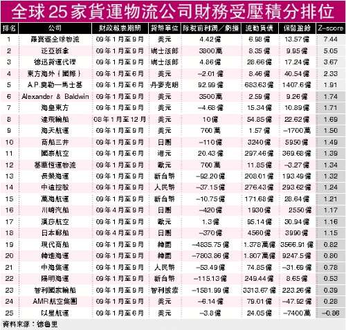 有關“貨運物流公司財務壓力積分統計”是以各公司在08年或09年已公布的財務報告作為客觀參考,然后經過Z-Score財務分析方程式計算,以計算后的Z-Score積分排位。Z-Score財務分析工具由美國學者奧爾特曼在1968年率先采用,針對各公司發布的財務報表,評估有關公司在兩年內倒閉的風險。