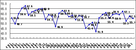 2010年1月,中國物流與采購聯(lián)合會(huì)(CFLP)發(fā)布的中國非制造業(yè)商務(wù)活動(dòng)指數(shù)為55.1%,比上月回落2.4個(gè)百分點(diǎn)。本月在中國非制造業(yè)PMI各單項(xiàng)指數(shù)中,積壓訂單指數(shù)、存貨指數(shù)和業(yè)務(wù)活動(dòng)預(yù)期指數(shù)的環(huán)比有所回升,其余大部分指數(shù)均有不同程度的回落。