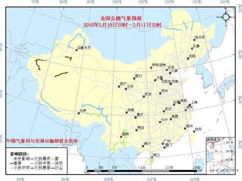 10日20時(shí)至11日20時(shí),新疆北部、西藏中東部、青海南部、川西高原南部、云南西北部、內(nèi)蒙古東北部、黑龍江西北部等地有小到中雪(雨)或雨夾雪,其中新疆西北部的部分地區(qū)有大雪;四川盆地南部、貴州西北部、云南東北部和南部、西藏東南部、海南、臺(tái)灣南部等地有小雨或陣雨。另外,新疆南疆盆地的部分地區(qū)有揚(yáng)沙或浮塵天氣。