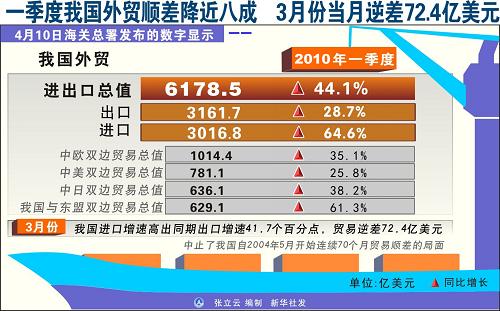 圖表:2010年一季度我國外貿順差降近八成 3月份當月逆差72.4億美元 新華社發(fā)