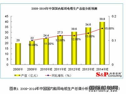 圖表1 2009-2014年中國國內船用電纜生產總值分析預測(單位:人民幣)
