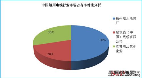 據尚普咨詢研究中心統計,位于江蘇揚州瓜洲鎮的原“揚州船用電纜廠”(現為“江蘇遠洋東澤電纜集團有限公司”)作為中國船用電纜的龍頭老大,大約要占到整個市場份額的一半,其集團2009年船用電纜的銷售收入近10億元人民幣。排在第二的為法國Nexans在中國的獨資企業“耐克森(中國)線纜有限公司”,大約占到20%左右的市場份額,余下的市場被江蘇地區及周邊其他企業瓜分。
