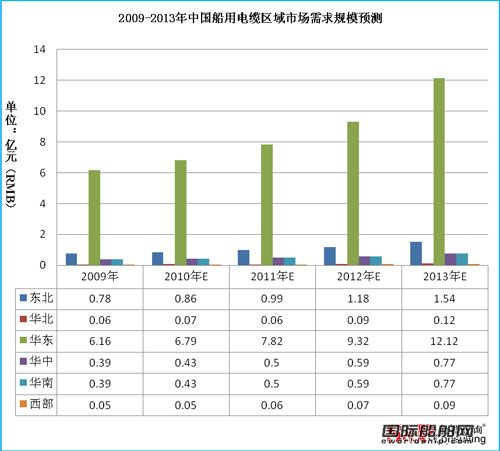 圖表 3 2009-2013年中國船用電纜區域市場需求規模分析預測(單位:人民幣)