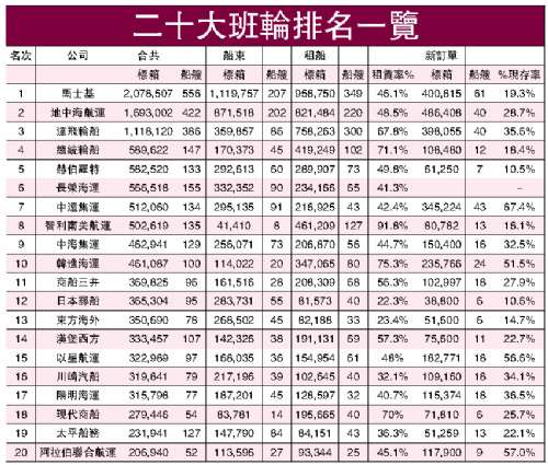 據巴黎航運咨詢公司Alphaliner近日公布的一份全球20大班輪公司最新排名榜顯示,因受運力調整、經濟波動等因素影響,排名一直相對較穩定的前5名航運公司有所變動,臺灣長榮海運跌出前5名,由第4位跌至第6位,美國總統輪船則取而代之。赫伯羅特公司在擴張德國航線后,運力上升25%,躋身第5位。