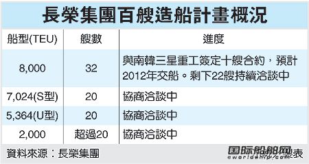 長榮百艘造船計劃首波正式啟動,7月2日和韓國三星重工簽約,將建造十艘8,000TEU集裝箱船,總金額高達新臺幣330億元,隨著長榮第一階段32艘造船計劃全數啟動,2012年起長榮將全面搭上航運市場榮景。