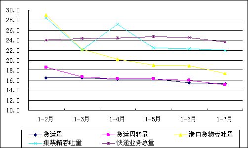 二是物流市場(chǎng)需求進(jìn)一步趨緩。今年以來,物流市場(chǎng)需求整體保持較快增長(zhǎng)。1-7月貨運(yùn)量同比增長(zhǎng)15.3%,貨運(yùn)周轉(zhuǎn)量同比增長(zhǎng)15.1%,港口貨物吞吐量同比增長(zhǎng)17.4%,集裝箱吞吐量同比增長(zhǎng)22%,快遞業(yè)務(wù)總量同比增長(zhǎng)23.6%,均保持較快增長(zhǎng),但增幅分別比上半年回落0.2個(gè)、0.9個(gè)、1.5個(gè)、0.3個(gè)和0.9個(gè)百分點(diǎn)。截至到7月底,鐵路、公路、水路、民航貨運(yùn)周轉(zhuǎn)量累計(jì)同比增幅分別比上半年回落0.8個(gè)、0.1個(gè)和0.7個(gè)和2.4個(gè)百分點(diǎn)。(參見圖2)