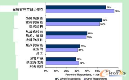 那么,供應鏈管理人員采取什么行動來緩解這些壓力,應對競爭呢?受訪者認為,企業(yè)最應做的事就是在所有環(huán)節(jié)上減少庫存。企業(yè)還需要為提高效率需要重構供應鏈組織,從戰(zhàn)略轉向戰(zhàn)術、短期改進的項目,減少供應鏈企業(yè)的員工,還應改善因客戶或供應商改變而產(chǎn)生的財務安排。