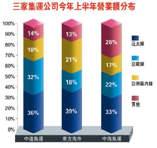 在5家集箱船公司中,中遠集運、韓進海運和NOL的收入都極為倚重遠洋航線。中遠集運上半年的68%營業額是來自歐美遠洋航線,亞洲區內或其它航線則只占32%,相較另外兩家在本港上市的集箱船公司明顯更依賴遠洋航線。