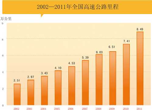 十年間,我國高速公路由2002年底的2.51萬公里增加到2011年底的8.49萬公里,躍居世界第二。截至2011年底,8.6萬公里國家高速公路網(wǎng)已經(jīng)建成6.4萬公里,占75%,在建的約1萬公里,占11%,預(yù)計到“十二五”末,國家高速公路網(wǎng)將基本建成。