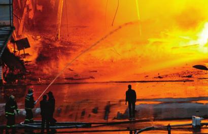 大火燃燒面積達(dá)4000平米,燃燒持續(xù)5個(gè)多小時(shí),機(jī)油等易燃品還引發(fā)爆炸滅火