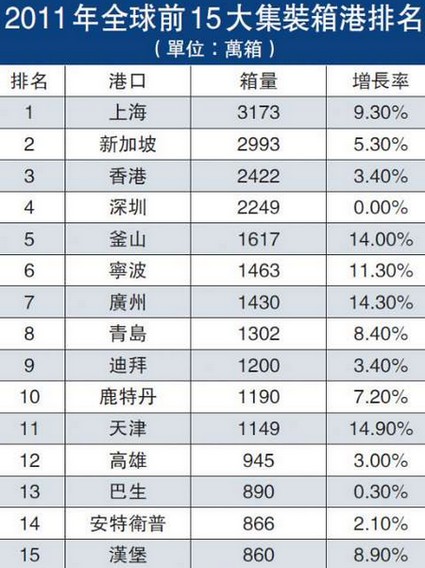 這其中,上海港繼續保持強勁增長勢頭,集裝箱年處理量連續第2年位居世界第一,實現3173.9萬箱,同比上漲9.18%;香港港繼續保持前三地位,箱量達到2422.4萬箱,同比增幅較小,上升3.4%;連云港、大連港、蘇州港、營口港的增長表現更是搶眼,增速均超過20%,使得中國港口集裝箱總吞吐量增幅繼續領先全球,在世界港口中所佔份額越來越大。
