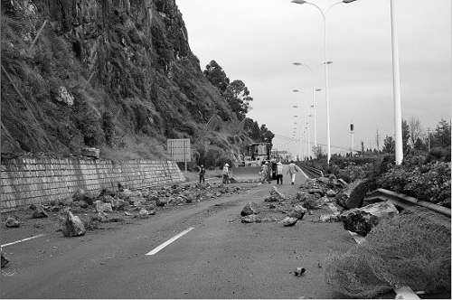 昨早8點,發(fā)現(xiàn)路上有落石后,高海公路投資開發(fā)有限責(zé)任公司對公路封閉清理。事發(fā)路段位于昆明至海口8公里處,大雨造成西山土質(zhì)松動,碎石從山上滾落到路上,落石路段長達20多米。