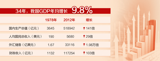 改革開放35年,中國(guó)經(jīng)濟(jì)總量連上新臺(tái)階,綜合國(guó)力大幅提升。1978年,我國(guó)經(jīng)濟(jì)總量?jī)H位居世界第十位;2010年超過日本,成為僅次于美國(guó)的世界第二大經(jīng)濟(jì)體。2008年下半年國(guó)際金融危機(jī)爆發(fā)以來,我國(guó)成為帶動(dòng)世界經(jīng)濟(jì)復(fù)蘇的重要引擎,2008—2012年對(duì)世界經(jīng)濟(jì)增長(zhǎng)的年均貢獻(xiàn)率超過20%。
