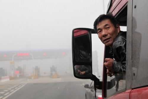 11月3日,車輛在長深高速江蘇贛榆入口處排起“長龍”,一名司機在駕駛室等待霧散放行。新華社發(fā)(司偉 攝)