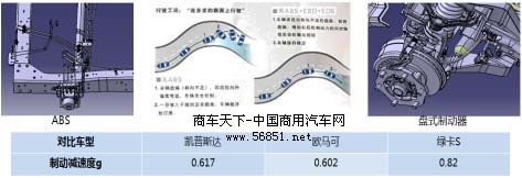 剎車抱死會(huì)發(fā)生車輛側(cè)滑、滑移的現(xiàn)象,嚴(yán)重時(shí)可釀成重大的交通事故,威脅用戶的人生安全,造成巨大財(cái)產(chǎn)、貨物損失。 為了保證用戶的駕車安全,開瑞綠卡采用了ABS+EBD制動(dòng)系統(tǒng), 這個(gè)在轎車中才使用配置也首次應(yīng)用到了綠卡的身上。根據(jù)測(cè)試,在60km/h的速度下,這套系統(tǒng)的運(yùn)用讓綠卡在剎車過程中有效縮短了制動(dòng)距離和制動(dòng)時(shí)間,其中制動(dòng)距離縮短6-8米,制動(dòng)減速度達(dá)到0.82g。其安全性明顯優(yōu)于國內(nèi)的其他輕卡品牌,已經(jīng)成為目前中國最“安全”的輕卡。下圖是關(guān)于制動(dòng)減速度幾款車型的對(duì)比
