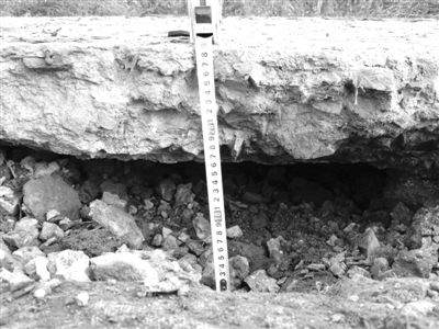 行駛在土門屯至葦塘屯的路上,記者發(fā)現(xiàn)路面多處大面積裂縫和路基塌方。在距離葦塘屯不遠(yuǎn)處,路段中間出現(xiàn)了一個直徑約1.5米的翻漿大坑。測量破損處的水泥路面,厚度只有15厘米,水泥路面與下面路基土層之間出現(xiàn)了15厘米左右的塌方沉降,水泥路面呈懸空狀態(tài)。在距葦塘屯1.3公里處,水泥路面下出現(xiàn)了長約5米,寬約2米的塌方,水泥路面大面積懸空令人觸目驚心。