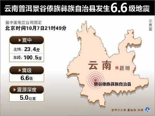 10月07日21時(shí)49分在云南省普洱市景谷傣族彝族自治縣(北緯23.4度,東經(jīng)100.5度)發(fā)生6.6級(jí)地震,震源深度5千米。災(zāi)害發(fā)生后,云南省交通運(yùn)輸系統(tǒng)各單位、各部門全力投入到了搶救群眾生命、抗擊地震災(zāi)害的斗爭中。