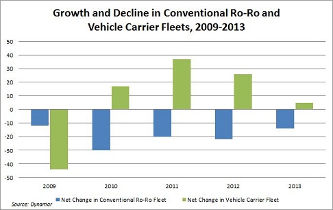 2009-2013年兩大船型船隊變化走勢圖顯示,在經歷了2009年的拆解高峰之后,汽車運輸船船隊規模逐年遞增,而傳統滾裝船數量逐步縮水。
