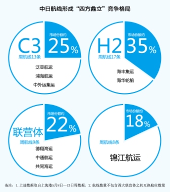 事實上,經過多年的競爭角逐,經營中日航線的航運企業善變而敏感。據《航運交易公報》記者了解,在C3聯盟籌劃期間,其他競爭對手也開始行動起來。于是,在C3聯盟簽署協議的同一天,海豐集運與海華輪船簽署亞洲區域戰略合作協議,被稱作為H2聯盟。然后,德翔海運、中通航運、共同海運3家所占市場份額較小的航運企業低調加大共艙合作,攜手前行。最后剩下的錦江航運盡管孤軍作戰,但其本身有較強競爭力。