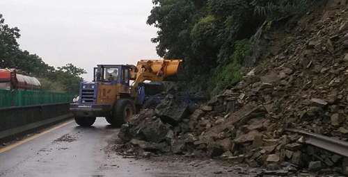 受連日暴雨影響,7月13日,福銀高速昌九段山體發(fā)生塌方,昌九管理處第一時間調(diào)集設備和人員對塌方點進行搶修。
