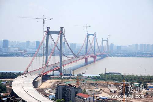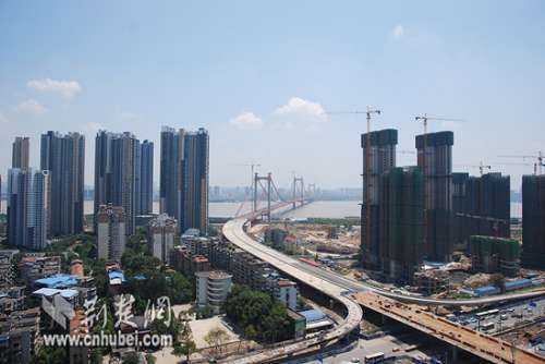 鸚鵡洲長江大橋漢陽接線段全長4公里, 起于鸚鵡大道與鸚鵡洲長江大橋的相接處,經(jīng)過馬鸚路、馬滄湖、動物園路,止于江城大道。目前橋梁主體結(jié)構(gòu)施工已經(jīng)完成3公里,并與鸚鵡洲長江大橋主橋合龍,而剩余的1公里,也正在進行最后11聯(lián)箱梁的同步施工,在2個月內(nèi)即可完成。記者登上已完成主體結(jié)構(gòu)的橋面看到,工人們正冒著酷暑進行防撞墻的施工。