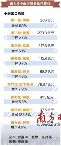去年同期,香港、美國與中山的雙邊貿(mào)易額分別為46.5億美元、42.9億美元,從目前的進出口形勢來看,歐美傳統(tǒng)市場正在復蘇,美國取代了香港成為中山排名第一位的貿(mào)易伙伴,新興市場則維持了較好的增長。據(jù)統(tǒng)計,今年1至8月,中山市外貿(mào)進出口總值1484.6億元,比去年同期(下同)增長1.4%。其中出口1099.5億元,增長1.3%,進口385億元,增長1.7%,貿(mào)易順差714.5億元