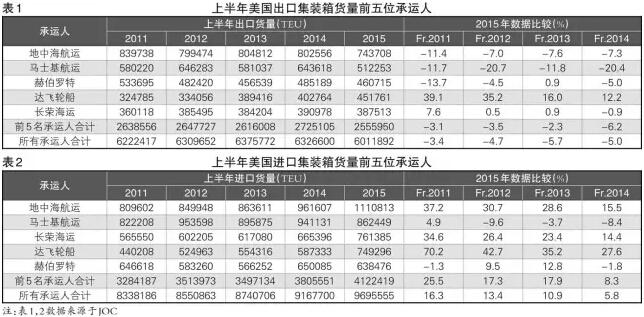 JOC統計數據顯示,上半年,美國出口集裝箱貨量呈下跌態勢,而進口集裝箱貨量呈現上漲態勢。出口市場,排名前五位的承運人共運輸255.60萬TEU,同比下跌6.2%,所有承運人則運輸601.19萬TEU,同比下跌5.0%(見表1);進口市場明顯好于出口市場,排名前五位的承運人共運輸412.24萬TEU,同比上漲8.3%,所有承運人則運輸969.56萬TEU,同比上漲5.8%(見表2)。