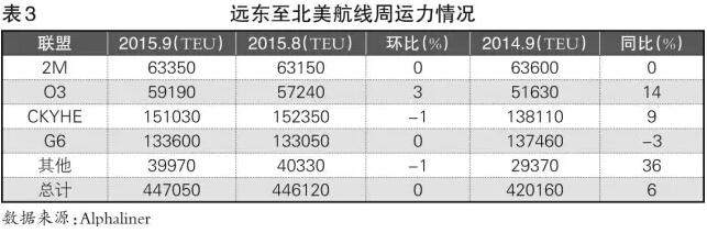 Alphaliner統計數據顯示,9月份,班輪公司在遠東至北美航線投入的周運力達到44.71萬TEU,同比增長6%(見表3)。其中,2M投入周運力6.34萬TEU,同比持平;O3投入周運力5.92萬TEU,同比增長14%;CKYHE投入周運力15.10萬TEU,同比增長9%;G6投入周運力13.36萬TEU,同比減少3%。