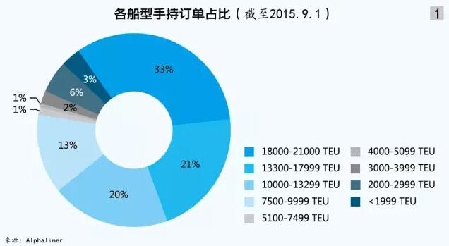 截至9月1日,根據Alphaliner的統計,在手持訂單方面,7500~9999TEU型船占13%,10000~13299TEU型船占20%。毫無疑問,這兩類船舶將成為未來美東航線的主力船型(見圖1)。
