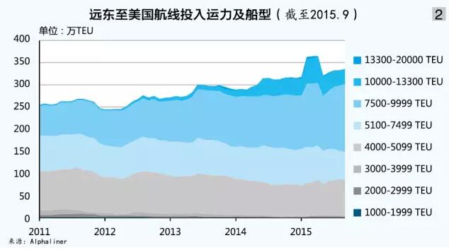 實際上,從班輪公司近年來在美國航線上投入的運力可以看出大船進入的趨勢正在加快。2011—2015年,7500TEU以上型船的投入明顯增多,特別是1萬~1.33萬TEU型船的投入(見圖2)。