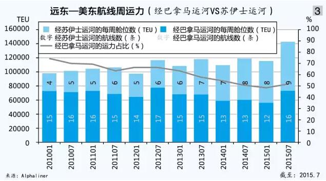 據統計,7月初遠東至美東航線的每周艙位同比增長約20%,破紀錄地達到14.3萬TEU。目前,該航線總計有25條航線,僅4月份和5月份在跨太平洋美東航線上就新開5組(4組 經巴拿馬運河,1組經蘇伊士運河)航線。目前,遠東至美東航線經巴拿馬運河的運力占比為51%,重新奪回被蘇伊士運河奪去的優勢。經巴拿馬運河的運力占比在2010年年初曾達到最高點74%,后來降至今年2月底最低點44%,3月份新航線開辟后,開始逐漸回升到目前的水平。