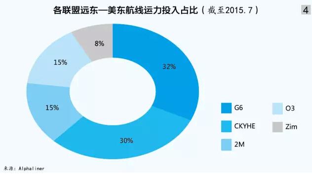 截至7月底,G6在遠東至美東航線上的市場份額占比為32%,拔得頭籌;CKYHE位居第二,占30%;2M和O3旗鼓相當,均占15%;以星航運占8%的市場份額(見圖4)。