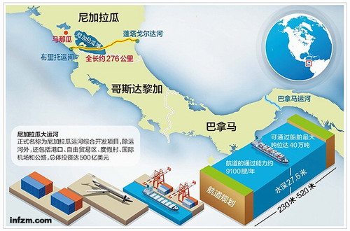 這是一條位于中美洲小國(guó)尼加拉瓜的大運(yùn)河,東西走向,連接太平洋與加勒比海,長(zhǎng)度三倍于巴拿馬運(yùn)河。貫通之后,將大大縮短兩邊航運(yùn)距離,如從委內(nèi)瑞拉開(kāi)往中國(guó),將節(jié)約兩個(gè)月的航行時(shí)間。