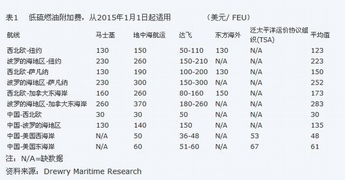 泛太平洋運價穩定協議組織(TSA)指出,從2015年1月1日起,托運人可以預期亞洲與美國東海岸間的初始低硫燃油附加費為67美元/FEU,亞洲和美國西海岸間為53美元/FEU,而目前這兩條航線的附加費分別為17美元/FEU和16美元/FEU。每TEU的低硫燃油附加費將是FEU附加費的90%水平。